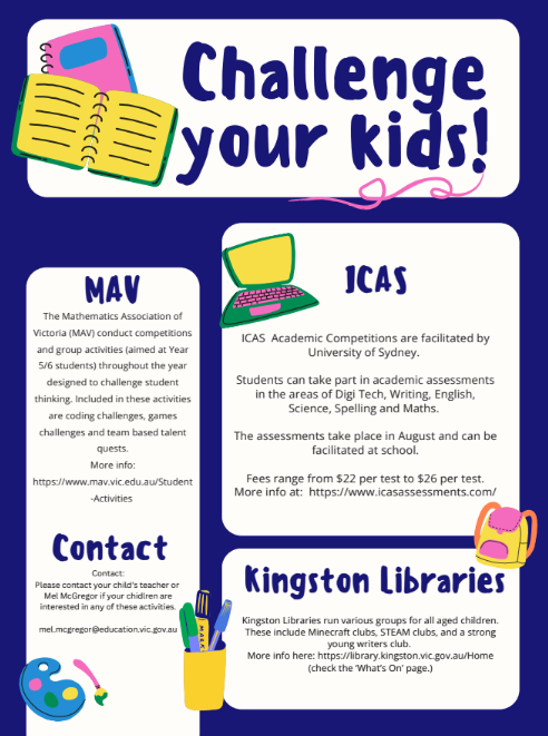 Looking ahead to next term we will have a parent information session on Thursday the 23rd of April at 3.30 relating to cyber safety and new rules around social media. This is an area that we need to work together on to best support our students to navigate their way through online communication and applications. More information including the links to access the session will be shared with families between now and the end of term.